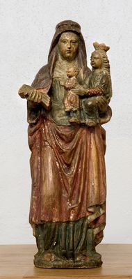 Bij deze beeldgroep van Sint Anna-te-Drieën wordt Anna staande afgebeeld, met Maria op haar arm. Deze laatste draagt op haar beurt weer het kind Jezus.