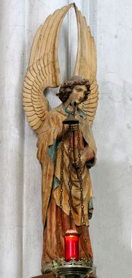 De beelden van de vier Engelen met opgaande vleugels, die links en rechts van het altaar tegen de muurpijlers staan, behoorden bij het altaar dat in de oorlog verwoest is. Zij zijn gesneden in dezelfde neogotische stijl als de nisbeelden Petrus en Paulus. Hun houding en uitdrukking is echter meer overtuigend. Dit komt wellicht door het feit dat het vrijstaande, niet gepersonifieerde figuren zijn, die het moeten hebben van hun algemene weergave.