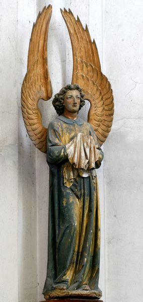 De beelden van de vier Engelen met opgaande vleugels, die links en rechts van het altaar tegen de muurpijlers staan, behoorden bij het altaar dat in de oorlog verwoest is. Zij zijn gesneden in dezelfde neogotische stijl als de nisbeelden Petrus en Paulus. Hun houding en uitdrukking is echter meer overtuigend. Dit komt wellicht door het feit dat het vrijstaande, niet gepersonifieerde figuren zijn, die het moeten hebben van hun algemene weergave.