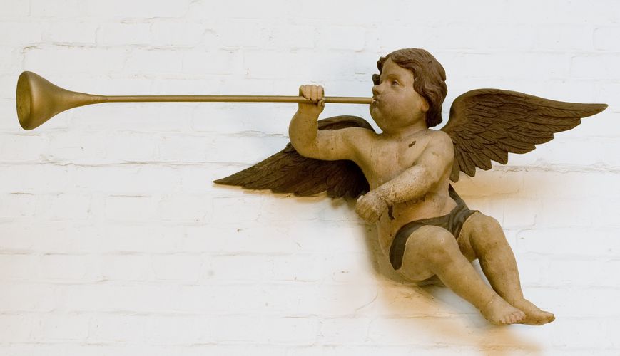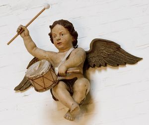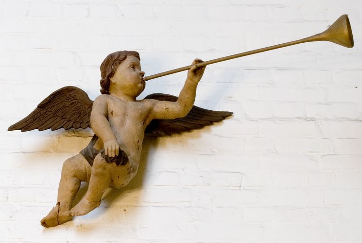 De engeltjes met de bazuinen links en rechts waren hoog op de kast aangebracht, met daar tussen in het beeld van de H. Cecilia, de patrones van de zangers. Het trommelende engeltje zat in het midden boven de eerste rij orgelpijpen.