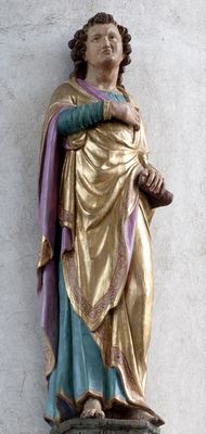 Het beeld van Johannes, uit de late middeleeuwen, is fors en toont een Johannes met golvend haar en blote voeten. In zijn linkerhand heeft hij een boek en zijn rechter is over zijn borst gevouwen. Zijn groen onderkleed is aan de onderkant versierd met een rode bies. Zijn lange, goudkleurige bovenkleed hangt over zijn schouders en wordt met zijn linkerarm tegen zijn middel geklemd. De polychromie is neogotisch.