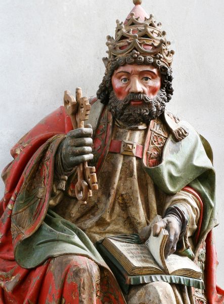 Petrus zit breed uit op een bank. Hij draagt de sleutels in zijn rechterhand en met zijn linkerhand bladert hij in een boek. Op zijn hoofd een tiara , de pauselijke driekroon, die het teken van zijn pauselijke ambt is. Hij is gekleed in een witte albe en superplie met daaroverheen een zware koorkap. De ketenen om zijn linkerpols - Petrus banden - zijn verdwenen.