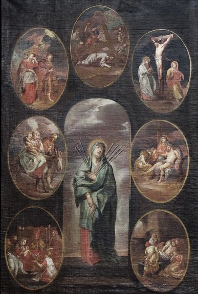 De zeven smarten staan uitgebeeld rondom Maria wier hart wordt doorboord met zeven zwaarden.