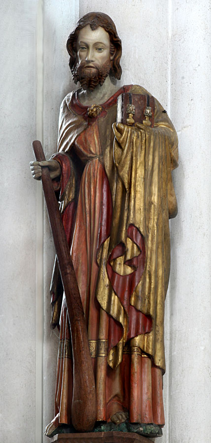 Het beeld van Jacobus Minor is het oudste van de apostelbeelden. De afwijkende houding, de in details uitgewerkte haartooi, de plooival in het kleed en het scherp getekend gelaat wijzen op een ontstaan van rond 1400 in de zuidelijke Maastreek.