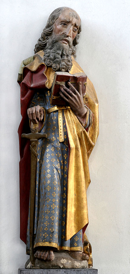 De heilige Paulus wordt hier voorgesteld met een zwaard in de rechter- en een geopend boek in de linkerhand. Ook het kalende voorhoofd met lange haren en baard is kenmerkend voor een beeltenis van deze heilige.
