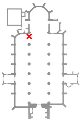 In tegenstelling tot de andere beelden in de kerk, allen van hout, is dit van zandsteen. Het draagt een aantal stilistische kenmerken die een herkomst uit het atelier van Meester Arnt aannemelijk maken zoals het naar voren gebogen hoofd, de gespreide vingers en het naar voren geplaatste been. Ook in de kleding is de hand van Meester Arnt herkenbaar. Het beeld is aan de achterzijde uitgehold, iets wat ook wijst op de hand van een houtsnijder.