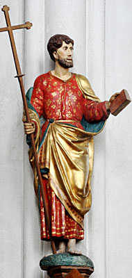 Philippus staat blootsvoets op zijn rechterbeen, met zijn bovenlichaam naar links gekeerd. Zijn linkerbeen is licht naar voren gebogen. Over zijn rode, versierde onderkleed draagt hij een ruim vallende mantel, waarvan de plooien minder diep gesneden zijn dan bij de andere apostelbeelden. Deze goudkleurige mantel wordt met een knoop bij zijn middel vastgezet.