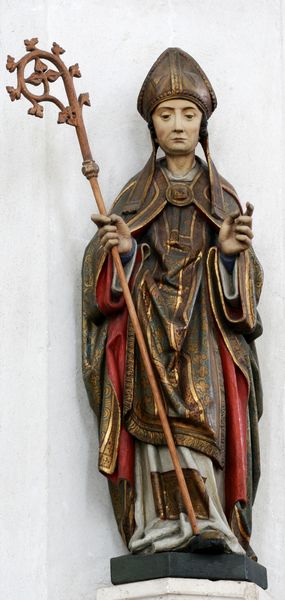 De kleding bestaat uit een albe met daarover heen een dalmatiek en koorkap. De mijter op zijn hoofd is afgezet met parels. De verschillende kledingstukken worden aangeduid door zware en minder zware plooien, die ontstaan door de lichte neiging naar rechts en omdat de koorkap geklemd wordt tussen zijn arm en lichaam.